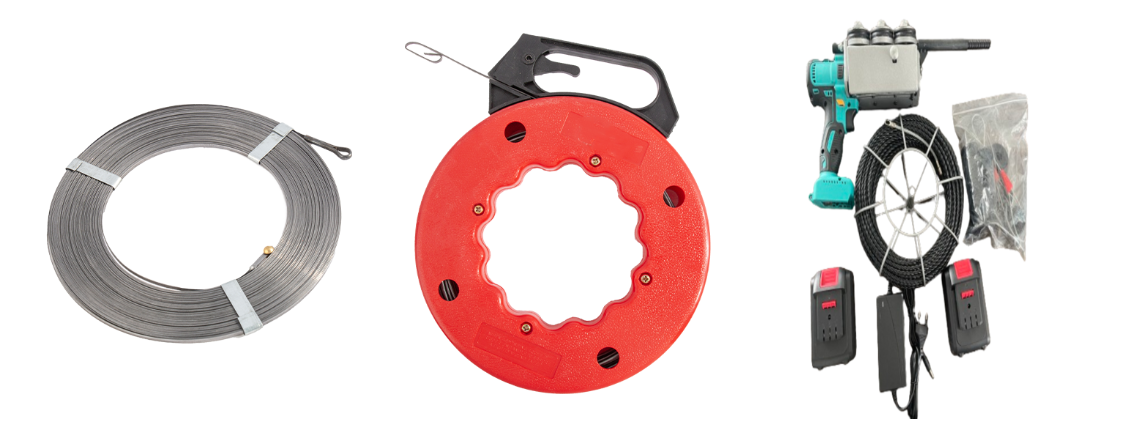 1- سوستة سحب الكيابل الكهربائية اليدوية: وهي عبارة شريط من الاستيل تأتي بأطوال مختلفة الشائع منها من 5 متر وحتى 50 متر وهناك أيضاً أطوال أكبر من ذلك ويتم إدخالها في خرطوم الكهرباء المراد سحب السلك فيه ومن ثم ربط السلك جيداً بطرف السوستة ثم سحبه للجهة الأخرى.